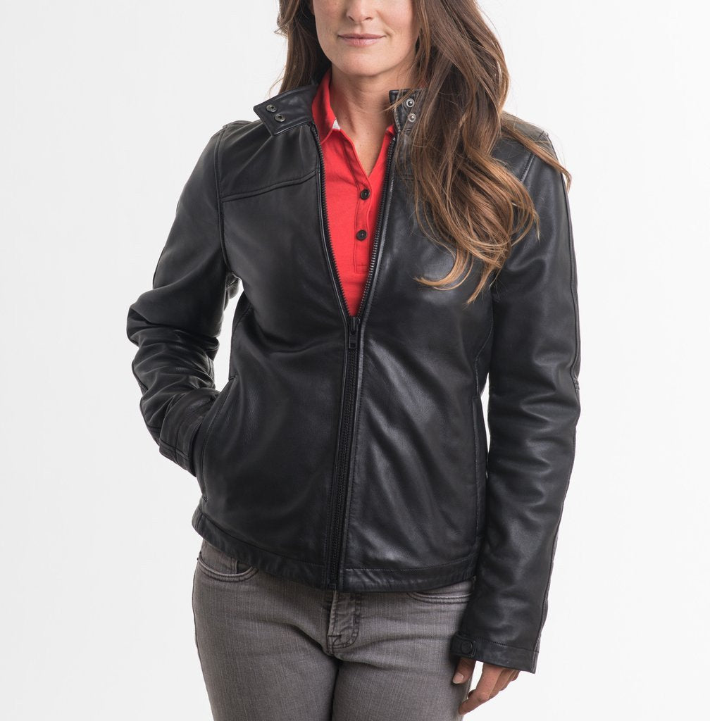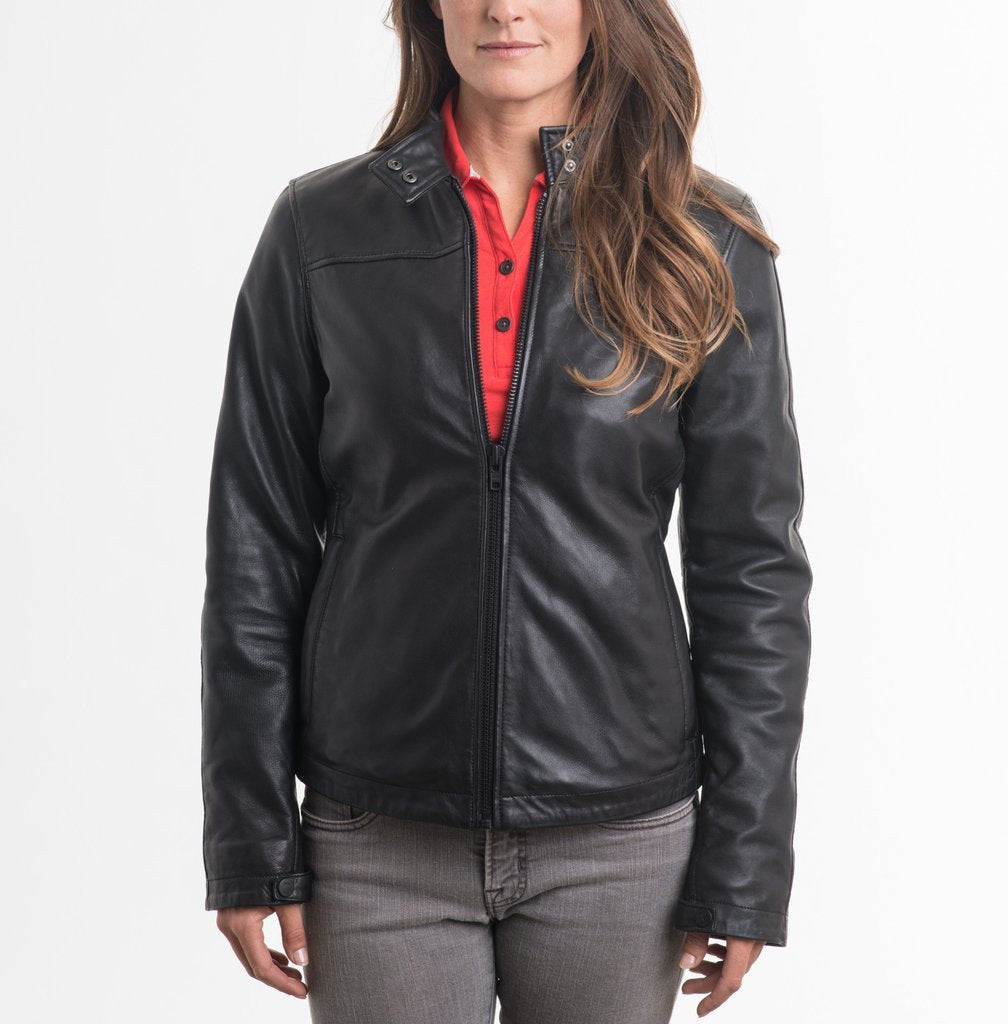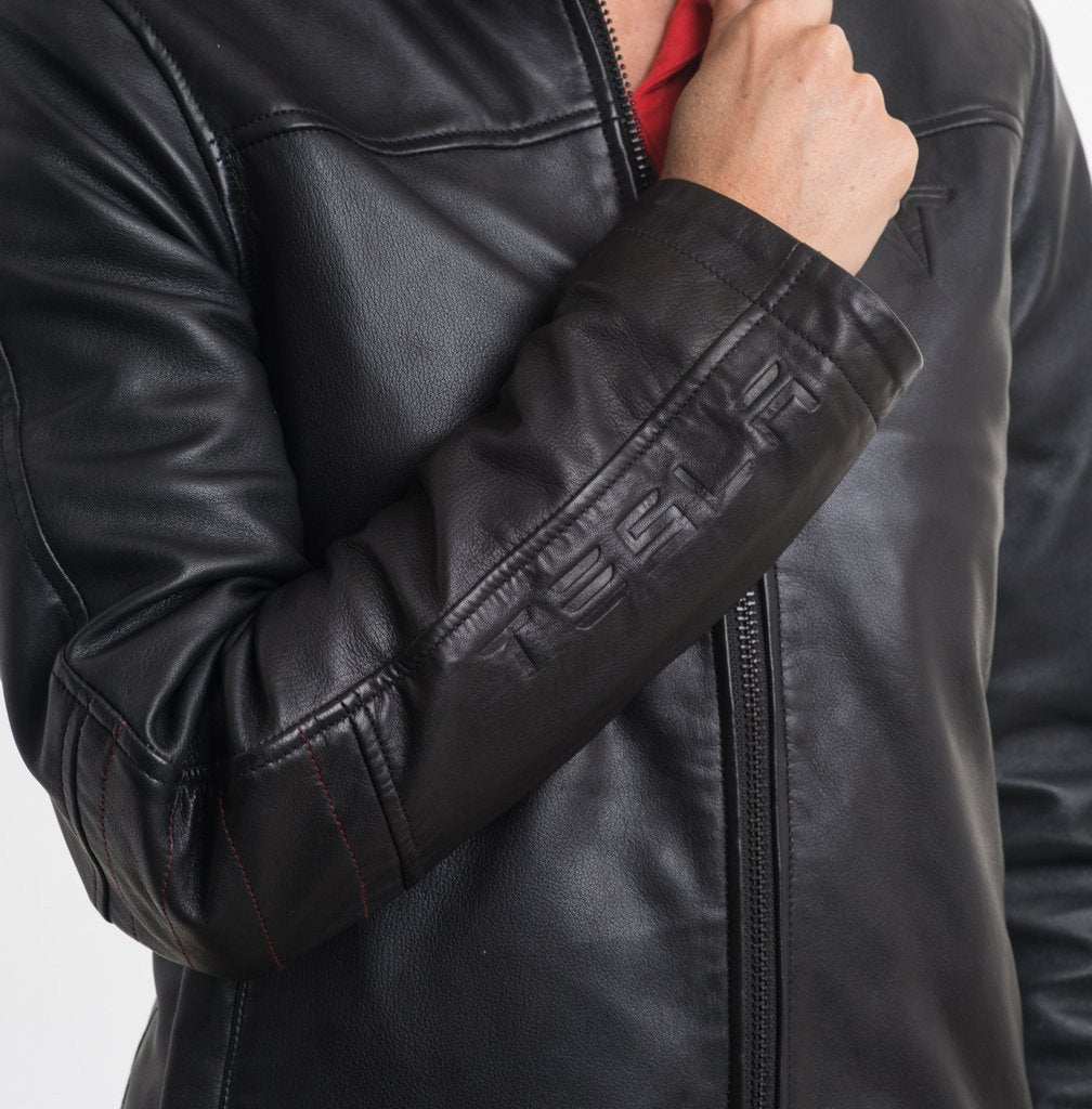 The Modena Leather Jacket is made of premium, full-grain sheep leather with quilted Cupro lining. The jacket is designed with clean lines and a slim fashion fit. Details such as a subtle debossed tone-on-tone Tesla logo as well as Tesla’s signature red contrast stitching and inside pocket welts complete the premium look and feel.